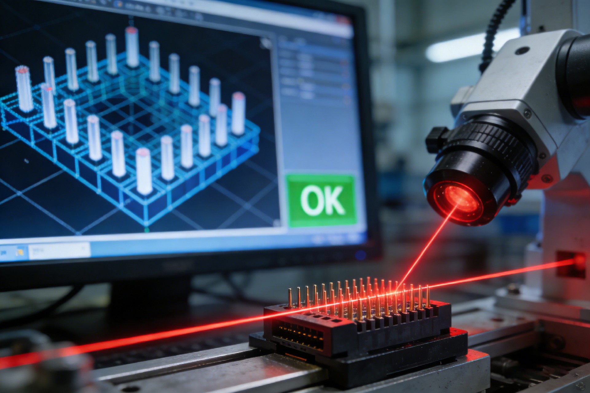 Advanced assembly lines utilize 3D Laser Profiling or High-Resolution CCD Cameras inline. Unlike offline batch testing, inline inspection checks 100% of the parts. It automatically rejects units where pin height deviation exceeds the specified tolerance (e.g., ±0.05mm), ensuring that every connector shipped is SMT-ready.